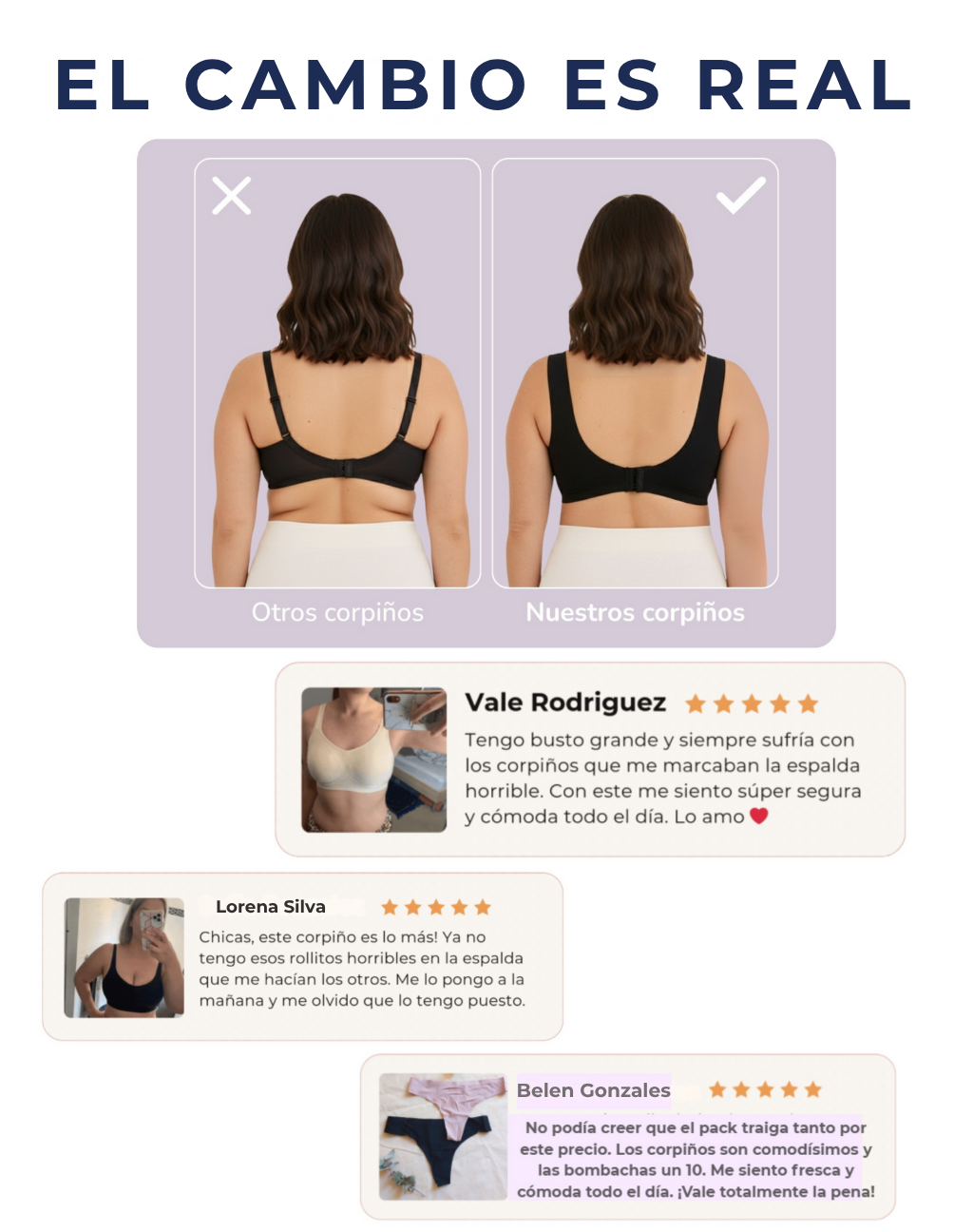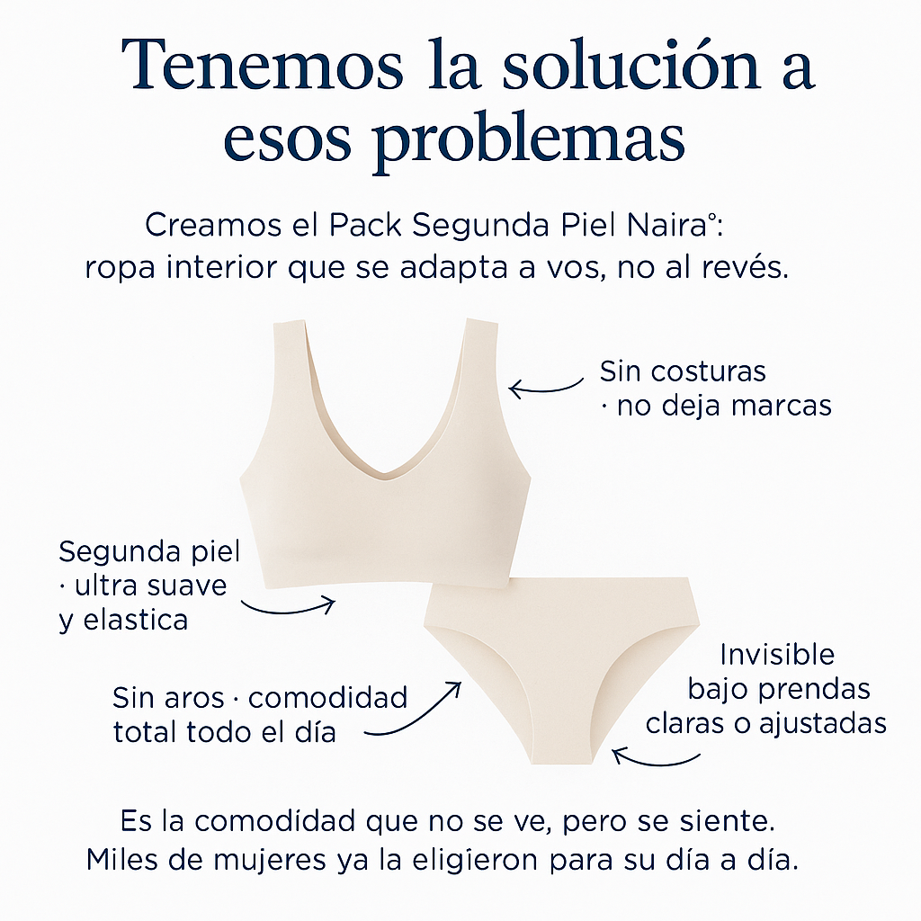 3 corpiños segunda piel + 3 bombachas sin costura de regalo. No se marcan, no aprietan y te acompañan todo el día.